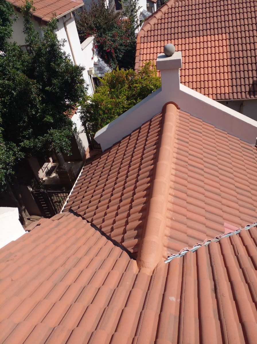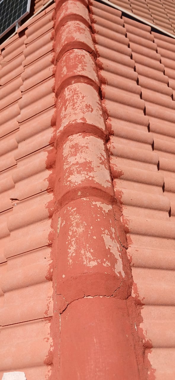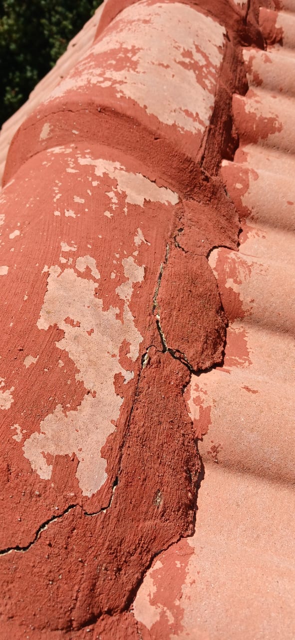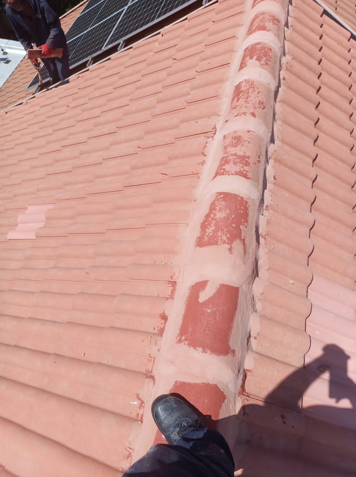 Call us today for a free inspection/assessmentStripping of loose mortar from ridge tiles on ridging.